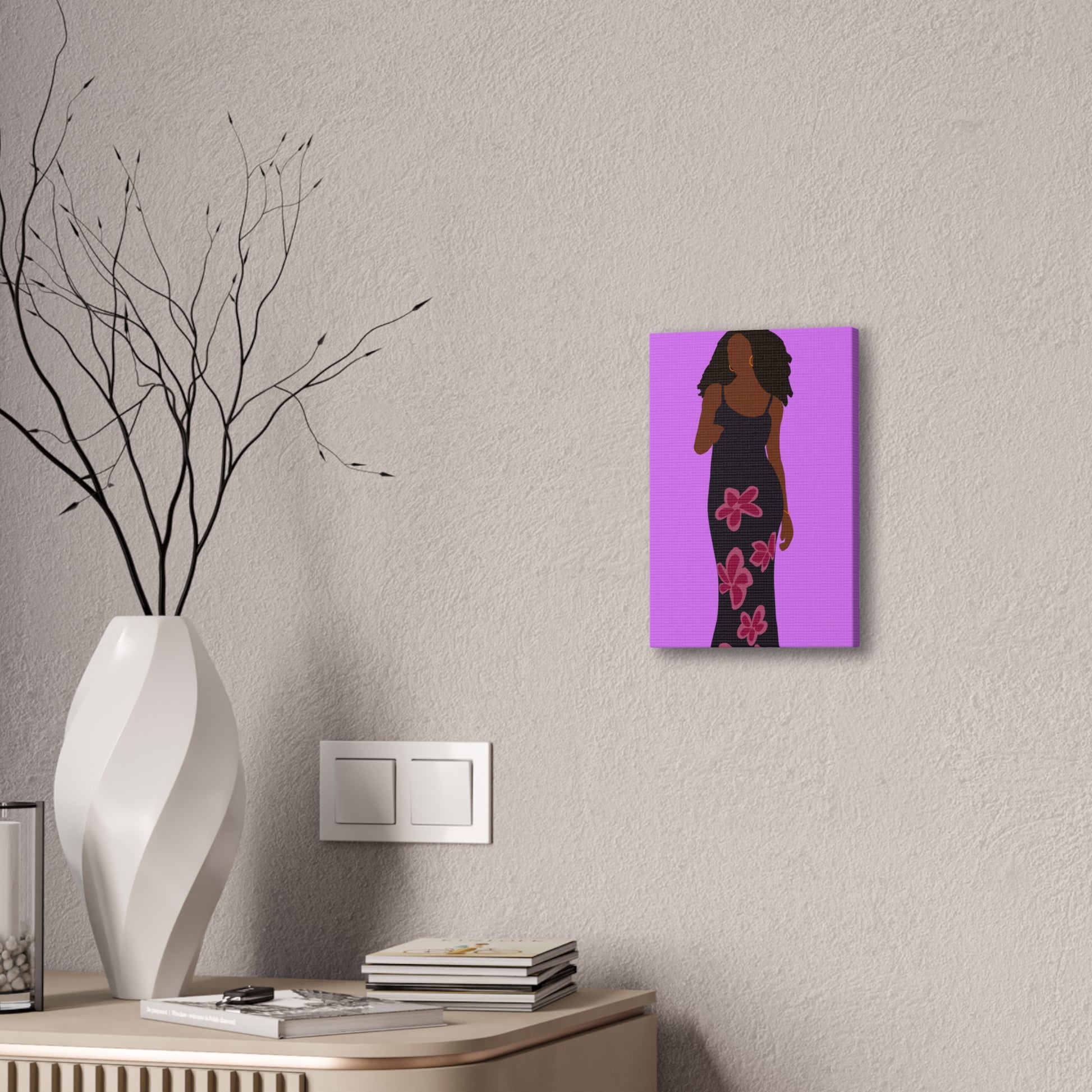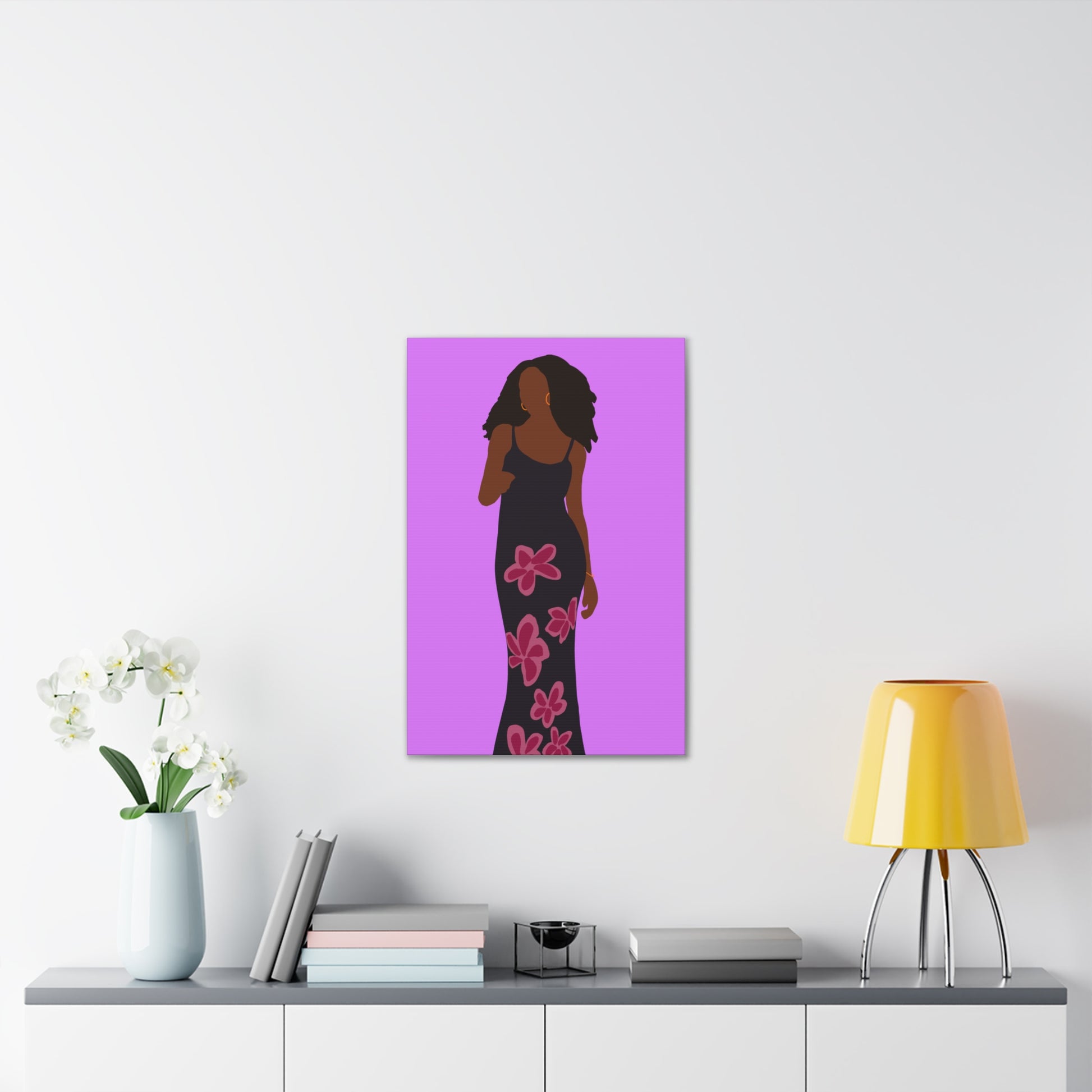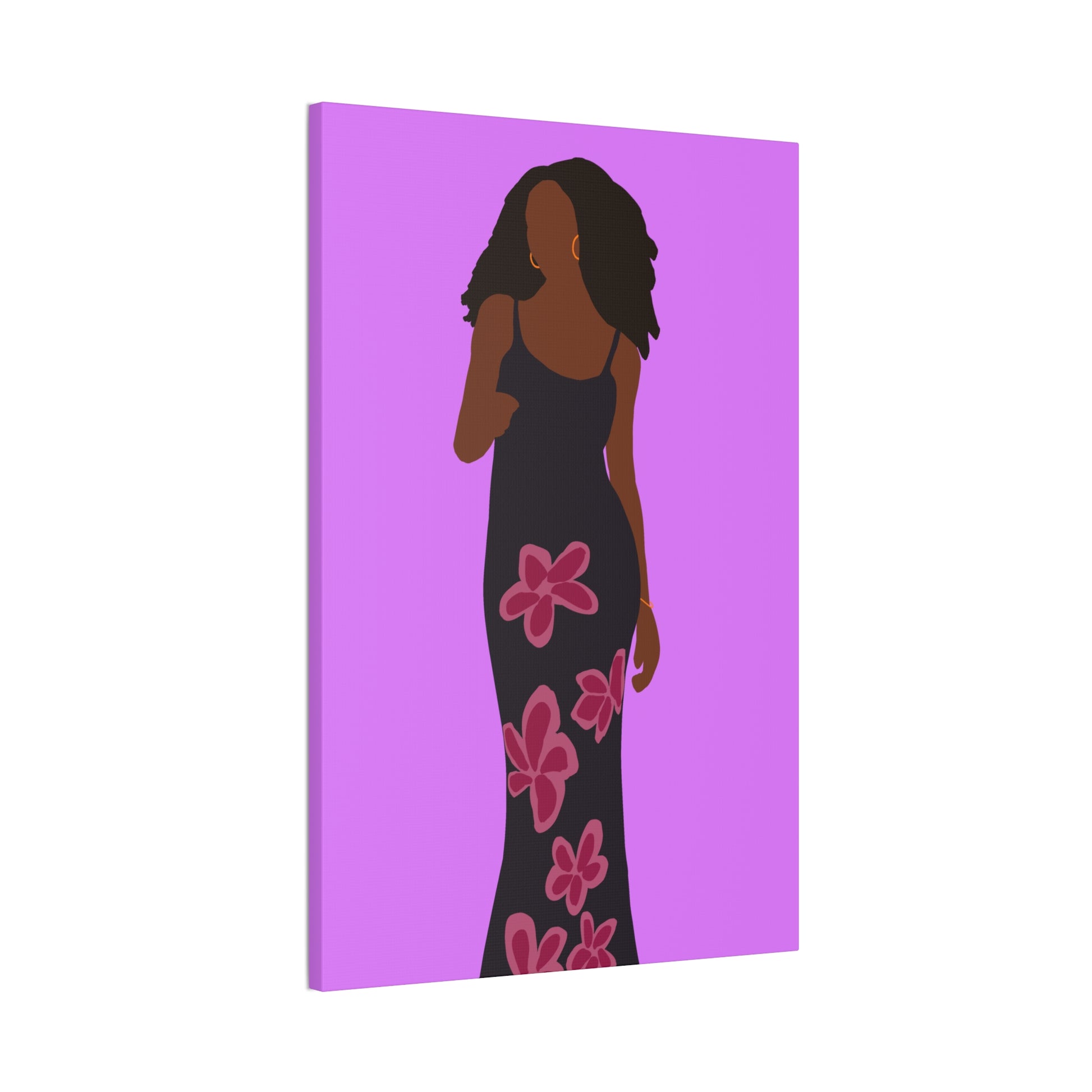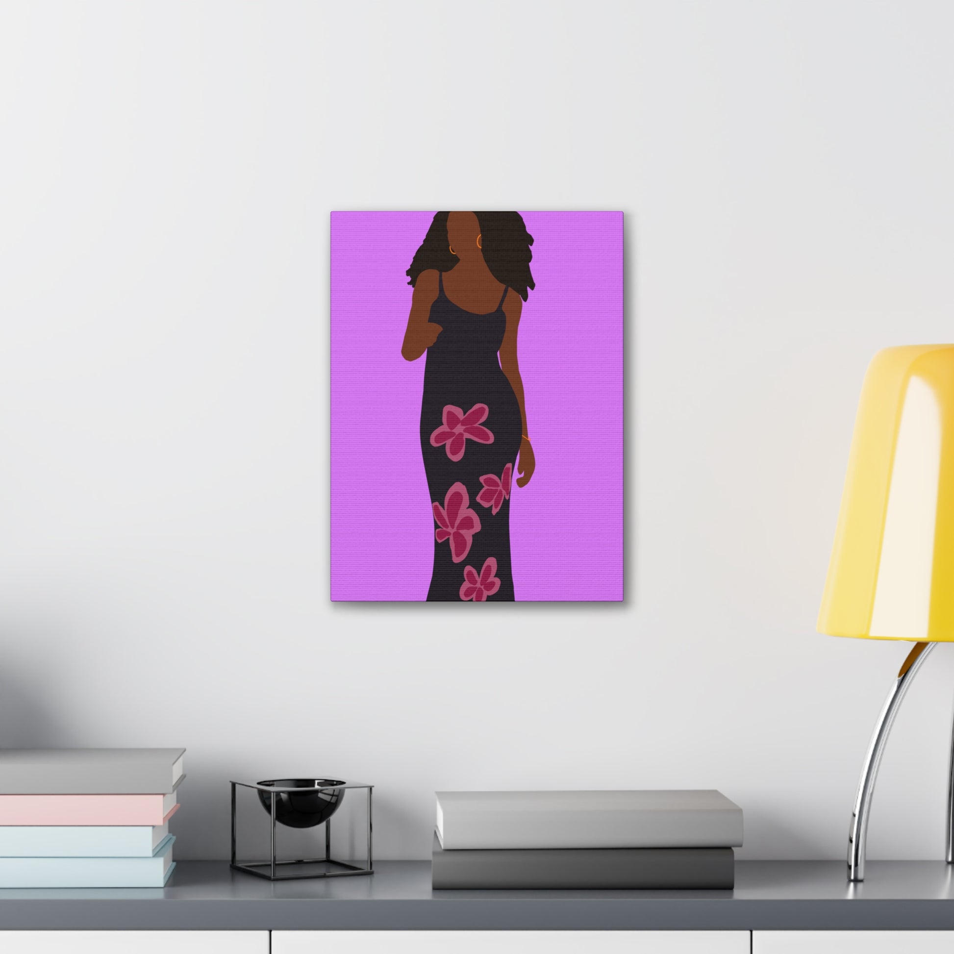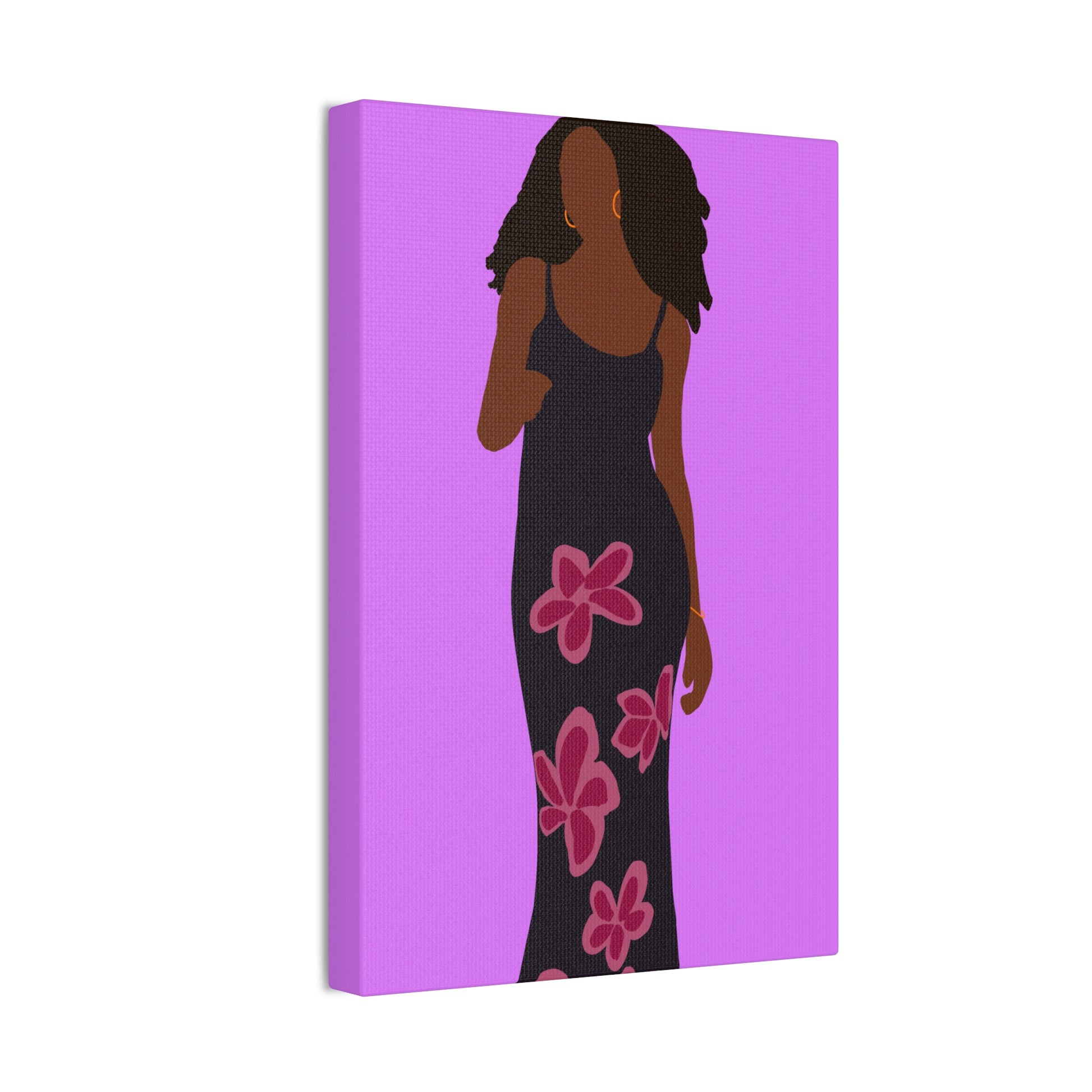 A vibrant stretched canvas that brings bold silhouette art to your walls. Rich magenta and deep black tones form a graceful figure in a floral gown, creating a statement piece that feels both modern and warm. The slim 0.75" pine frame gives the artwork a clean, gallery-style edge so it sits flush against the wall and reads elegantly in vertical, horizontal, or square arrangements. Bright, crisp printing preserves the saturated background and flower details, so the image remains lively from across the room. Ready to hang with included hardware and a small QR code on the back for provenance or care instructions, this canvas works as a focused accent over a console, beside a vanity, or as part of a curated gallery wall for anyone who loves bold color and fashion-forward imagery.