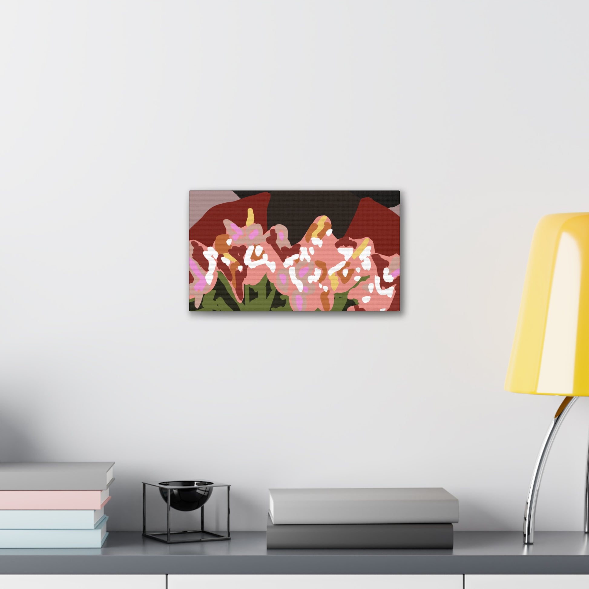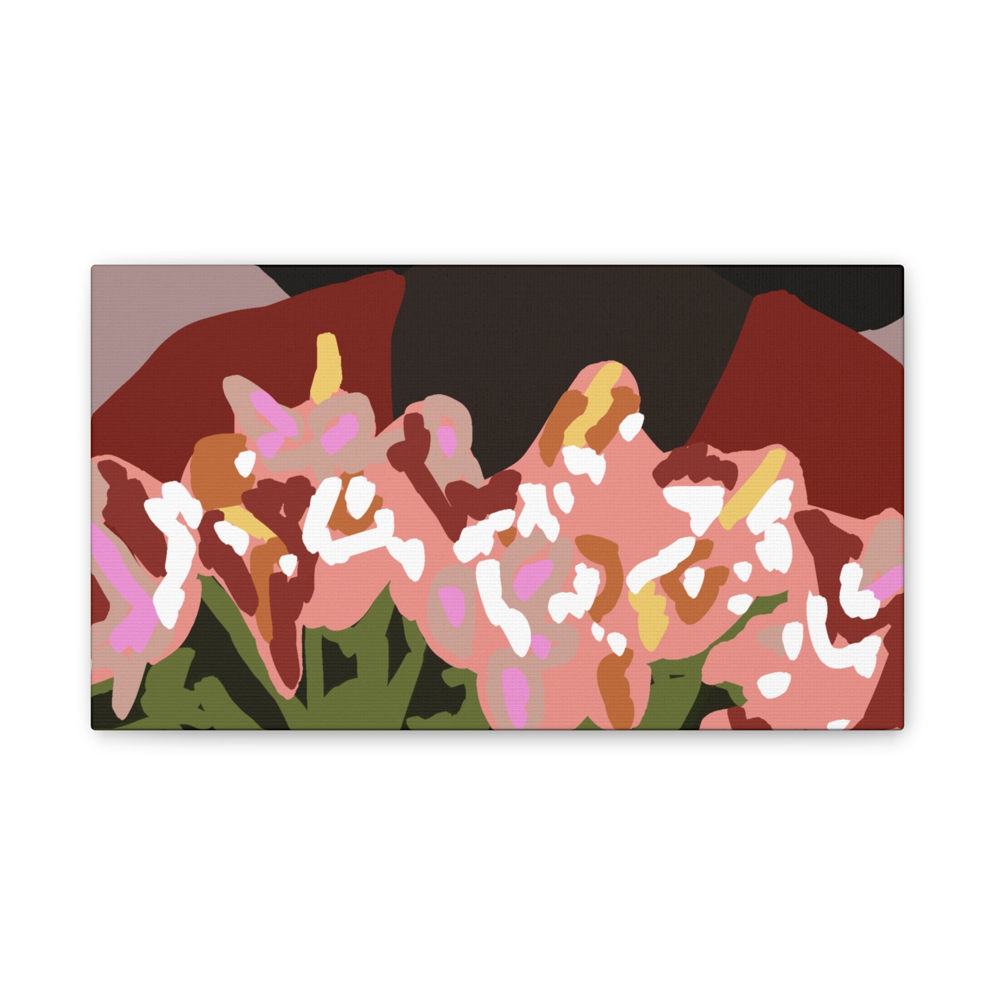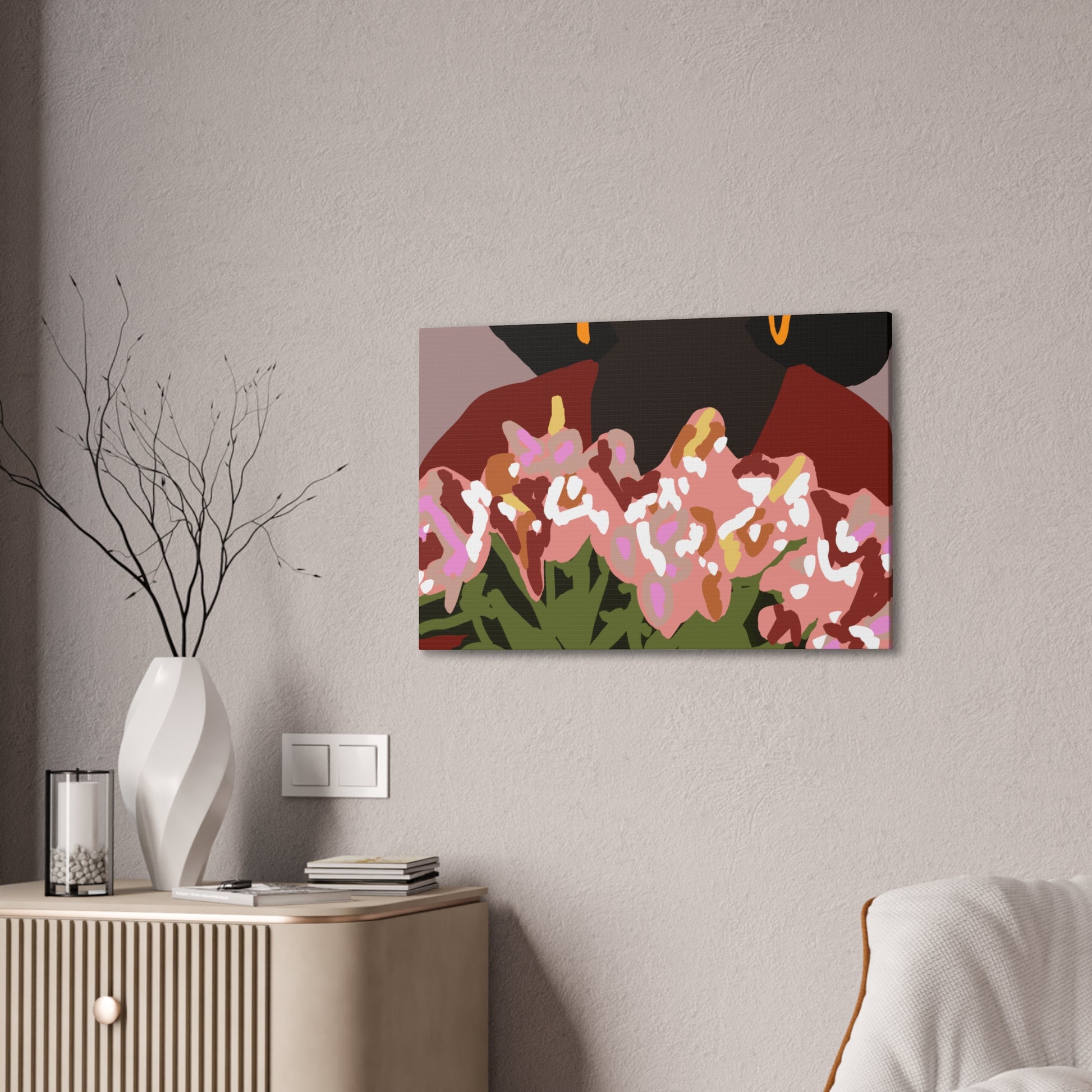 A warm, stretched canvas print that brings quiet strength and soft color into a living space. The artwork shows a silhouetted figure holding a bouquet of painterly blooms — broad, muted tones and bold shapes create a calm, intimate mood. Hung on a pine stretcher bar, the piece reads like a personal moment: an evening visit, a thoughtful gift, or a gentle focal point above a sofa or entry table. The texture of the polyester canvas and the saturated inks keep the colors rich while the low-profile 0.75" frame keeps the look modern and approachable. Comes ready to hang with hardware included and a discreet QR code on the back for care or provenance details.