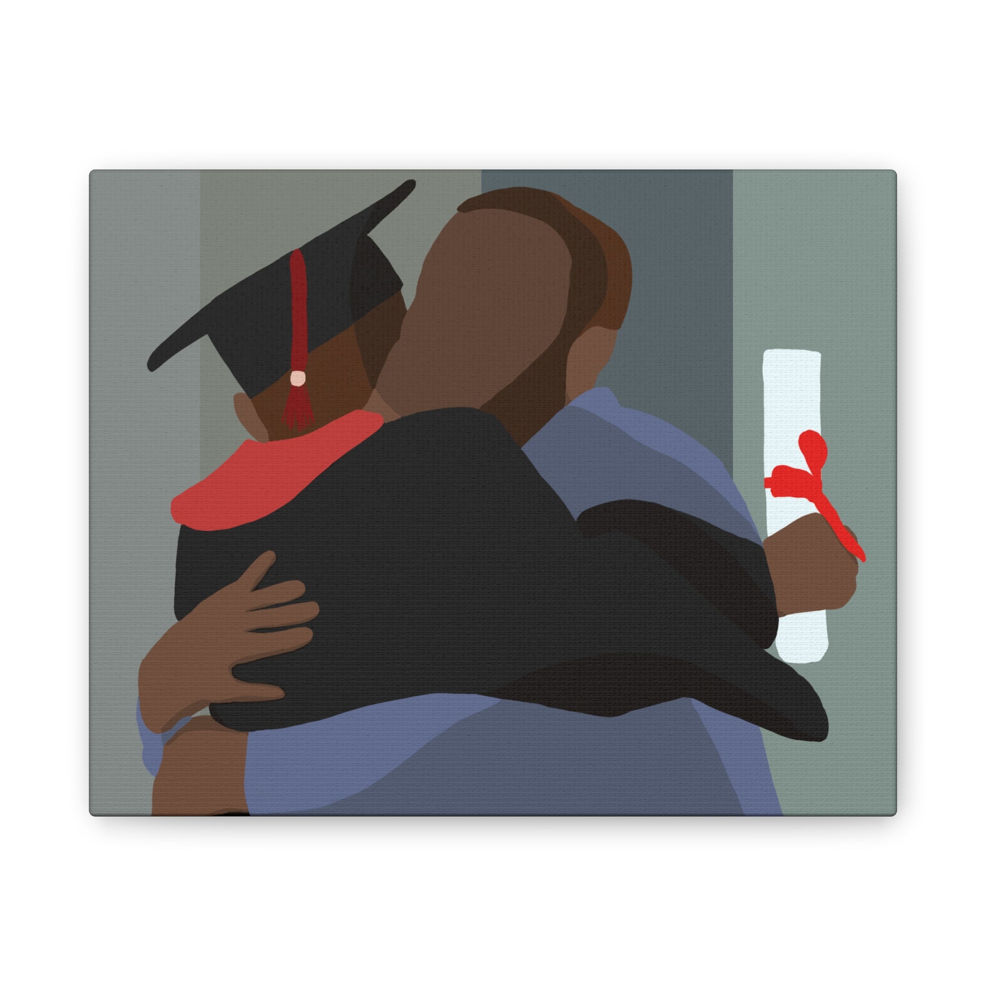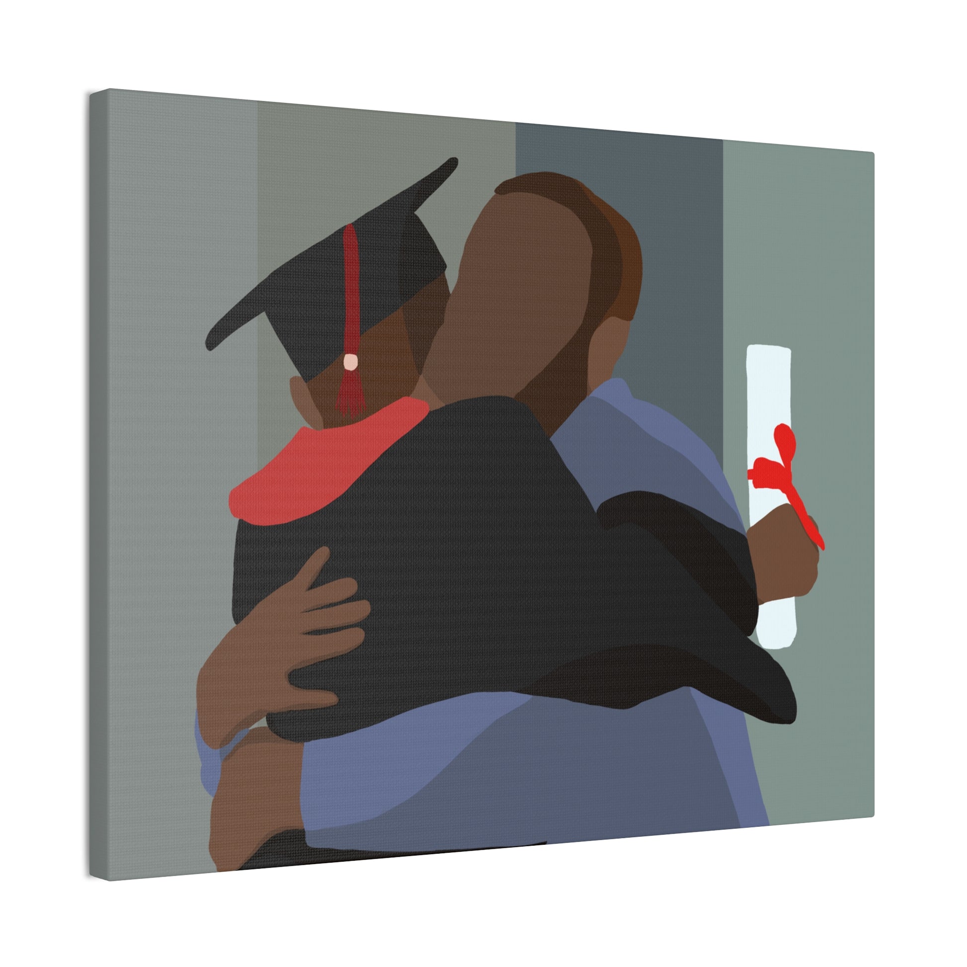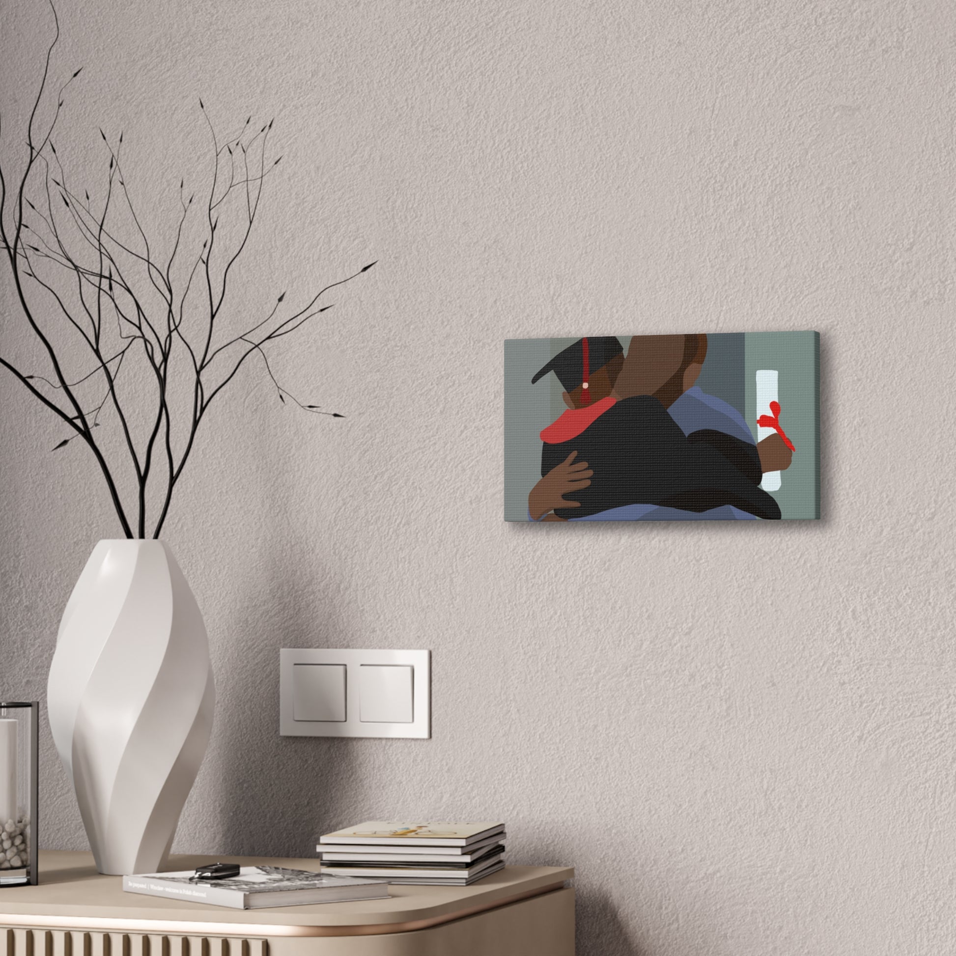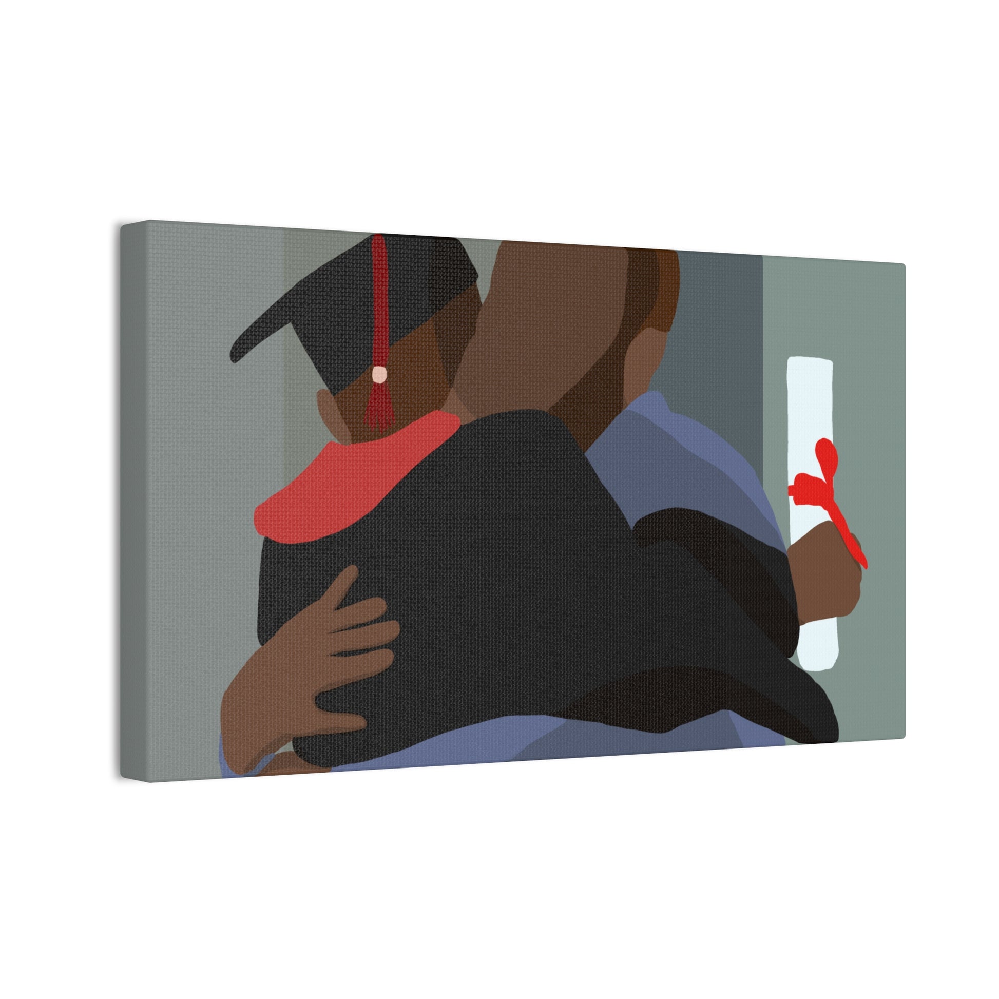 This stretched canvas print captures a quiet, powerful moment: a graduate embraced by a loved one, diploma in hand. Printed on heavy 100% polyester canvas and stretched over a sturdy pinewood frame, the image’s bold, modern color blocks stay vivid and crisp. The shallow 0.75" depth keeps the piece close to the wall for a framed look that works in hallways, living rooms, or study nooks. Delivered ready to hang with mounting hardware and a small QR code on the back for authentication or care info, it’s a meaningful keepsake that holds a milestone in simple, contemporary style.