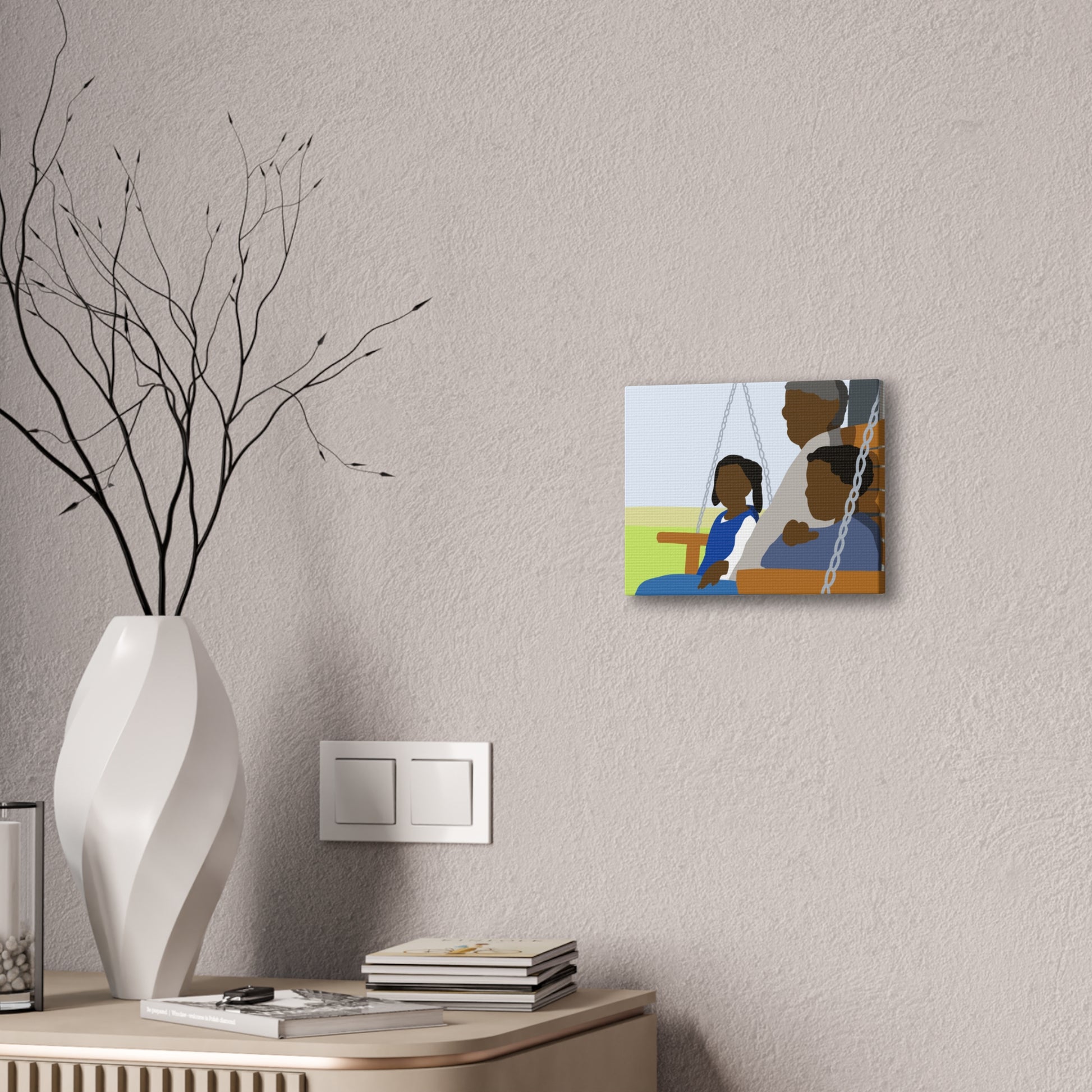 Canvas stretched over a solid pine frame, this wall art brings quiet afternoons on the porch into your home. The illustration shows three generations sharing a swing—soft shapes, warm tones, and crisp printing that keeps the scene feeling intimate and calm. Hang it in a living room, hallway, or reading nook to anchor a space with gentle storytelling and subtle color. The lightweight profile and included mounting hardware make installation simple, and the range of sizes means you can choose a scale that reads like a window onto a familiar moment.
