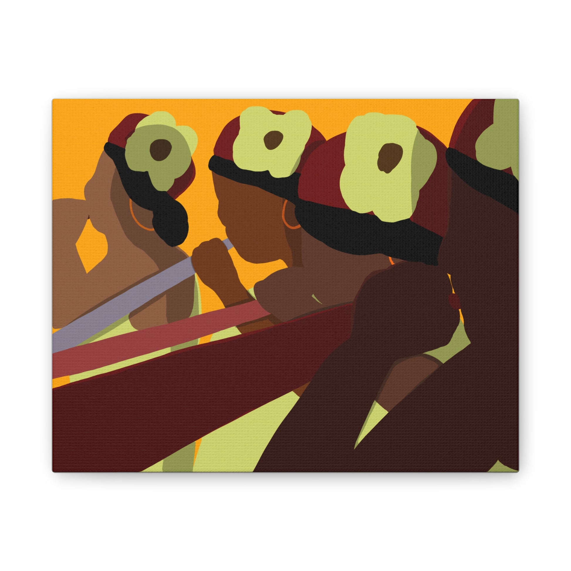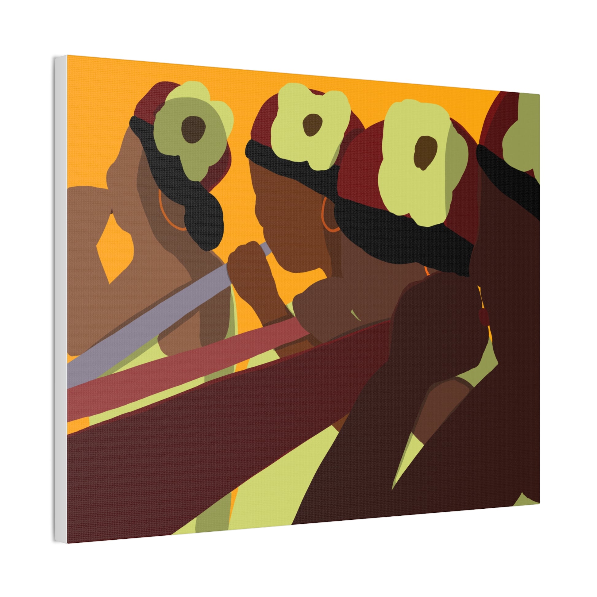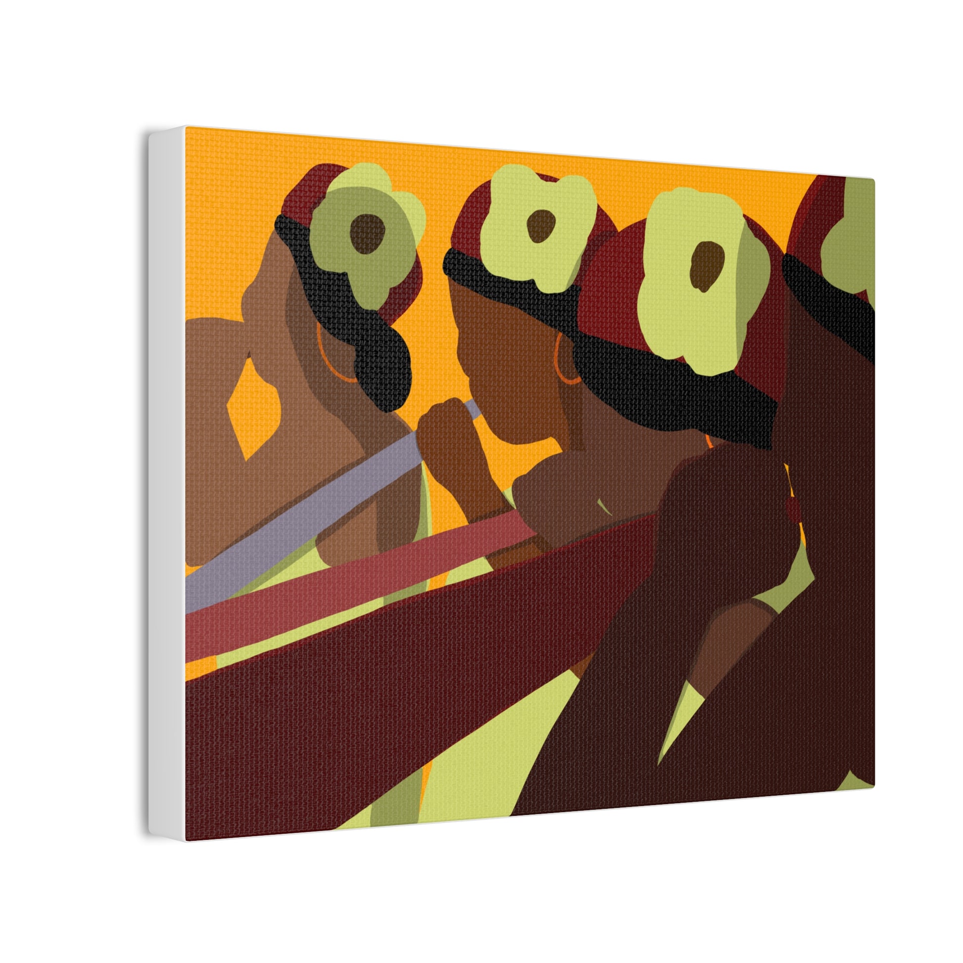This stretched canvas brings a warm, rhythmic scene into any room — bold, simplified figures pass a shared moment bathed in sunset tones. The rich oranges, deep burgundies, and soft greens pop against the textured polyester, giving the piece a gallery-ready presence while keeping a handmade warmth. Hang it on a dining-room accent wall, above a mantel, or in a cozy studio to spark conversation and anchor a space with cultural energy and movement. The pine stretcher frame keeps the composition taut and ready to display right out of the box; small QR codes on the back link to care and origin details.