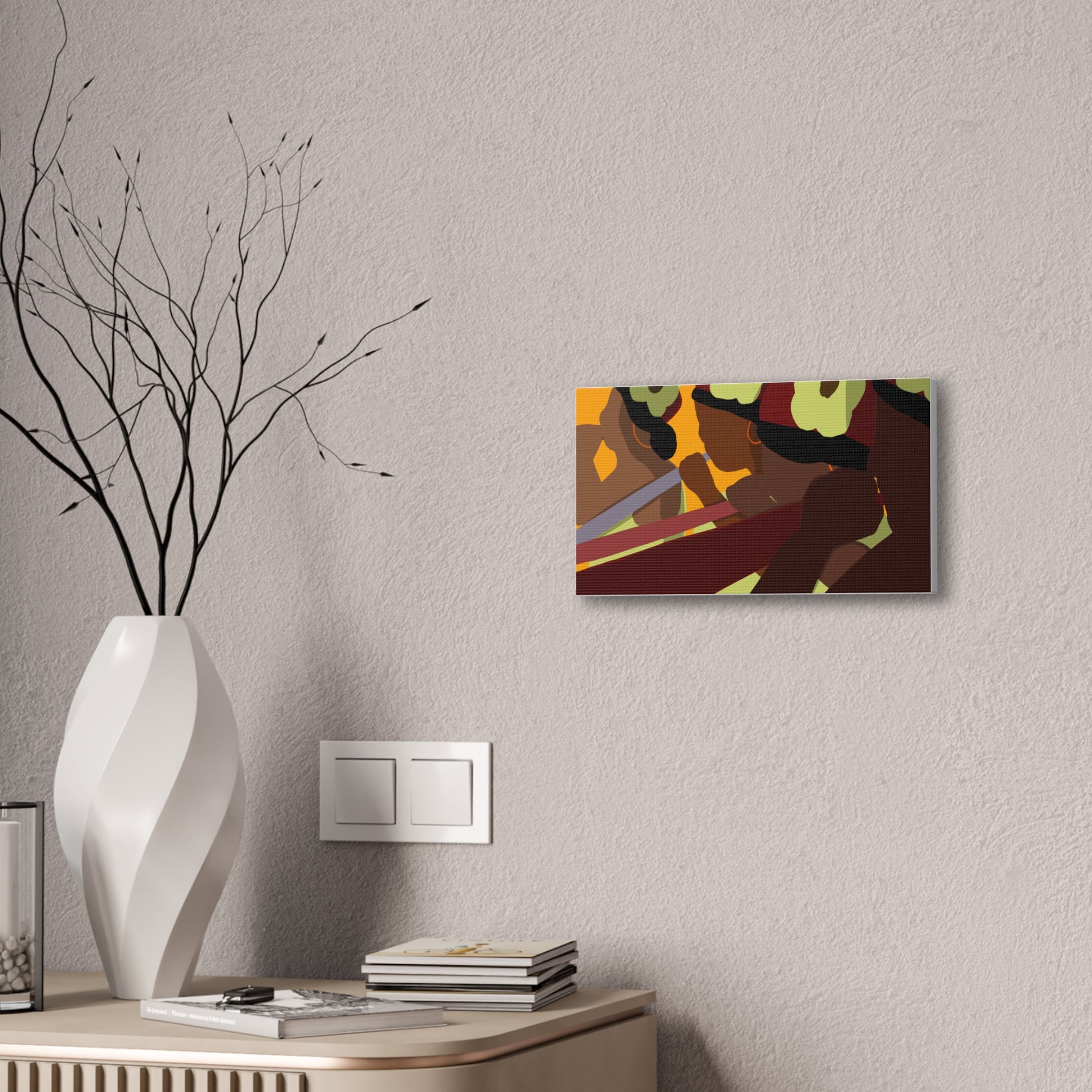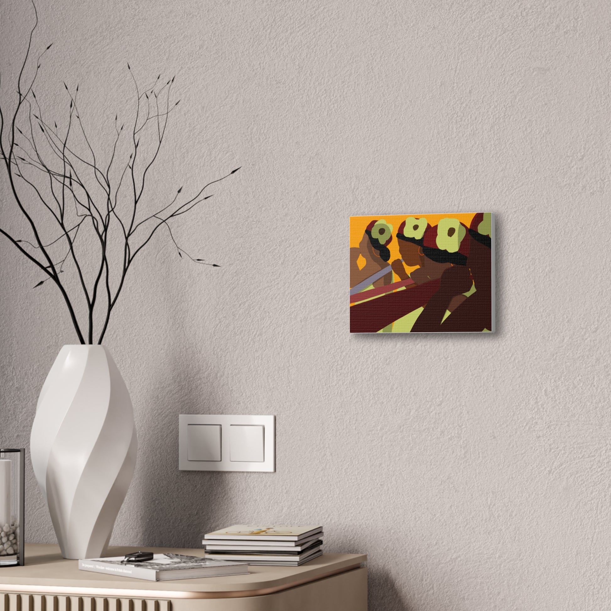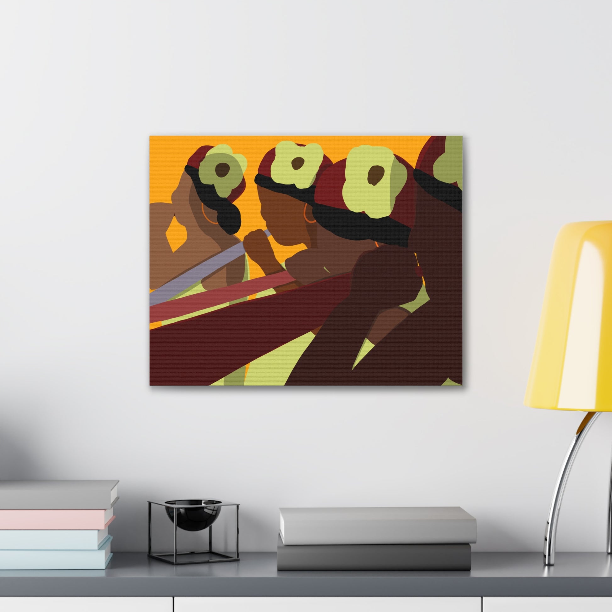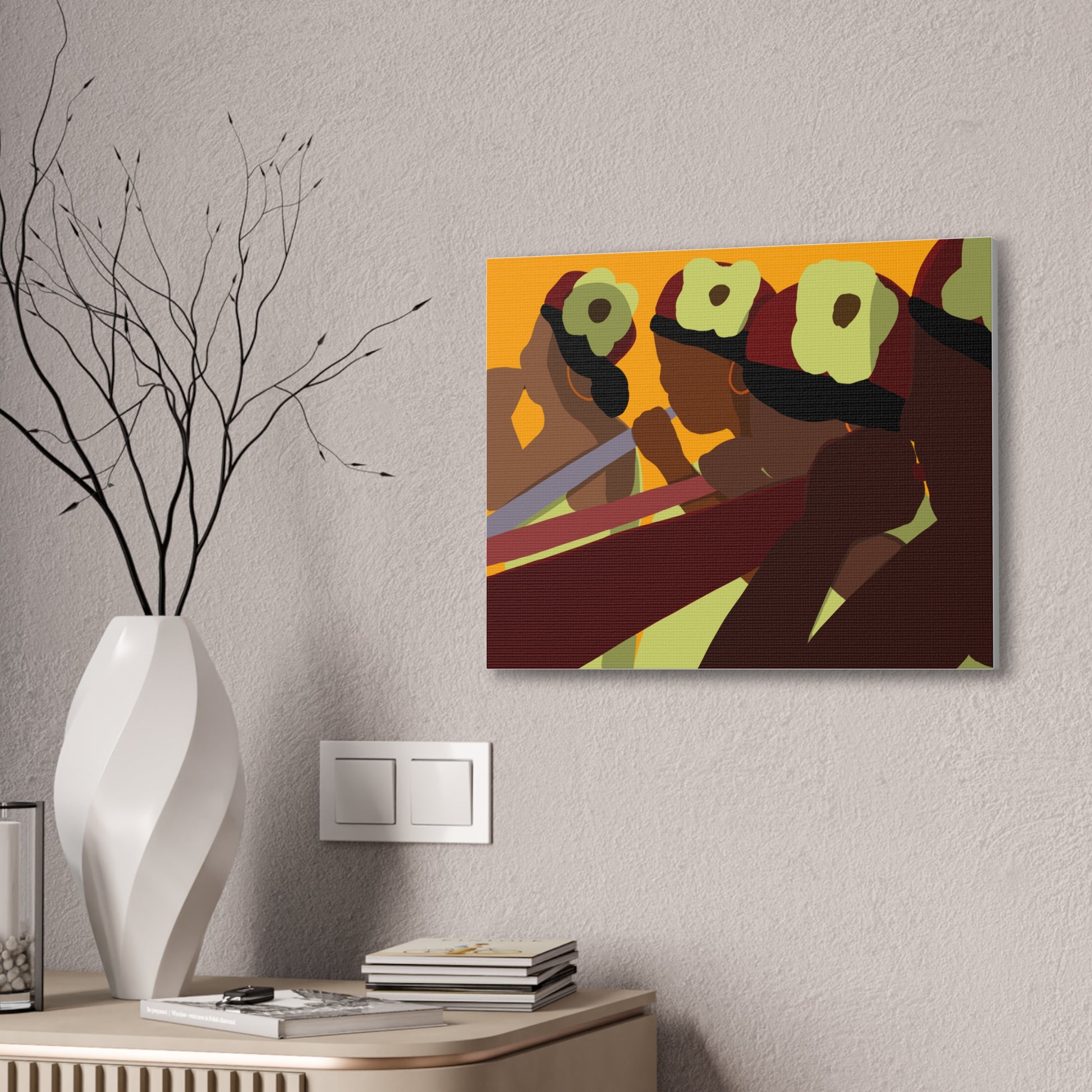 This stretched canvas brings a warm, rhythmic scene into any room — bold, simplified figures pass a shared moment bathed in sunset tones. The rich oranges, deep burgundies, and soft greens pop against the textured polyester, giving the piece a gallery-ready presence while keeping a handmade warmth. Hang it on a dining-room accent wall, above a mantel, or in a cozy studio to spark conversation and anchor a space with cultural energy and movement. The pine stretcher frame keeps the composition taut and ready to display right out of the box; small QR codes on the back link to care and origin details.