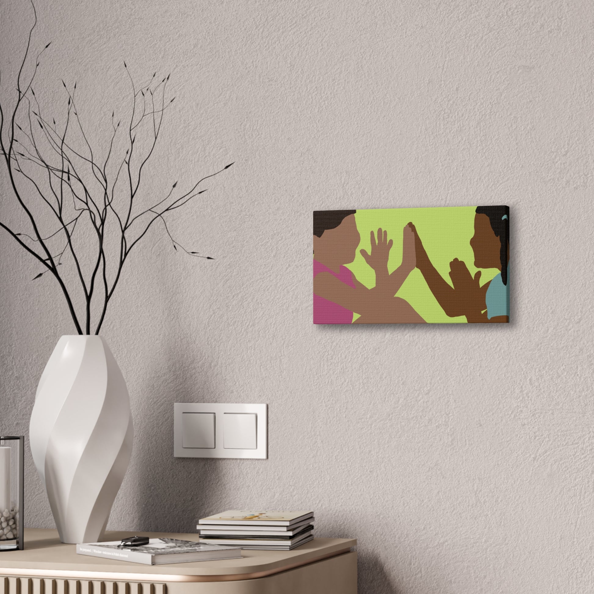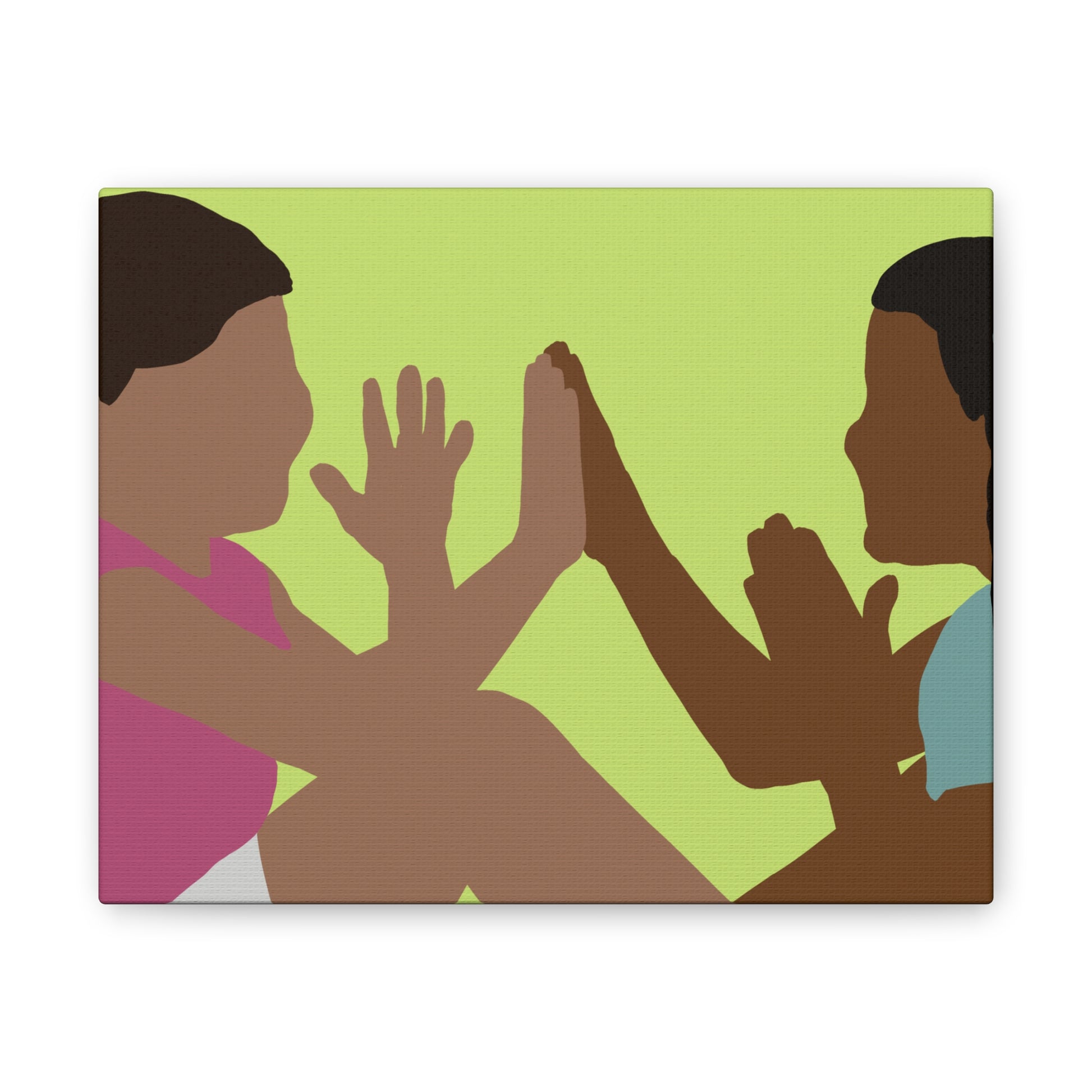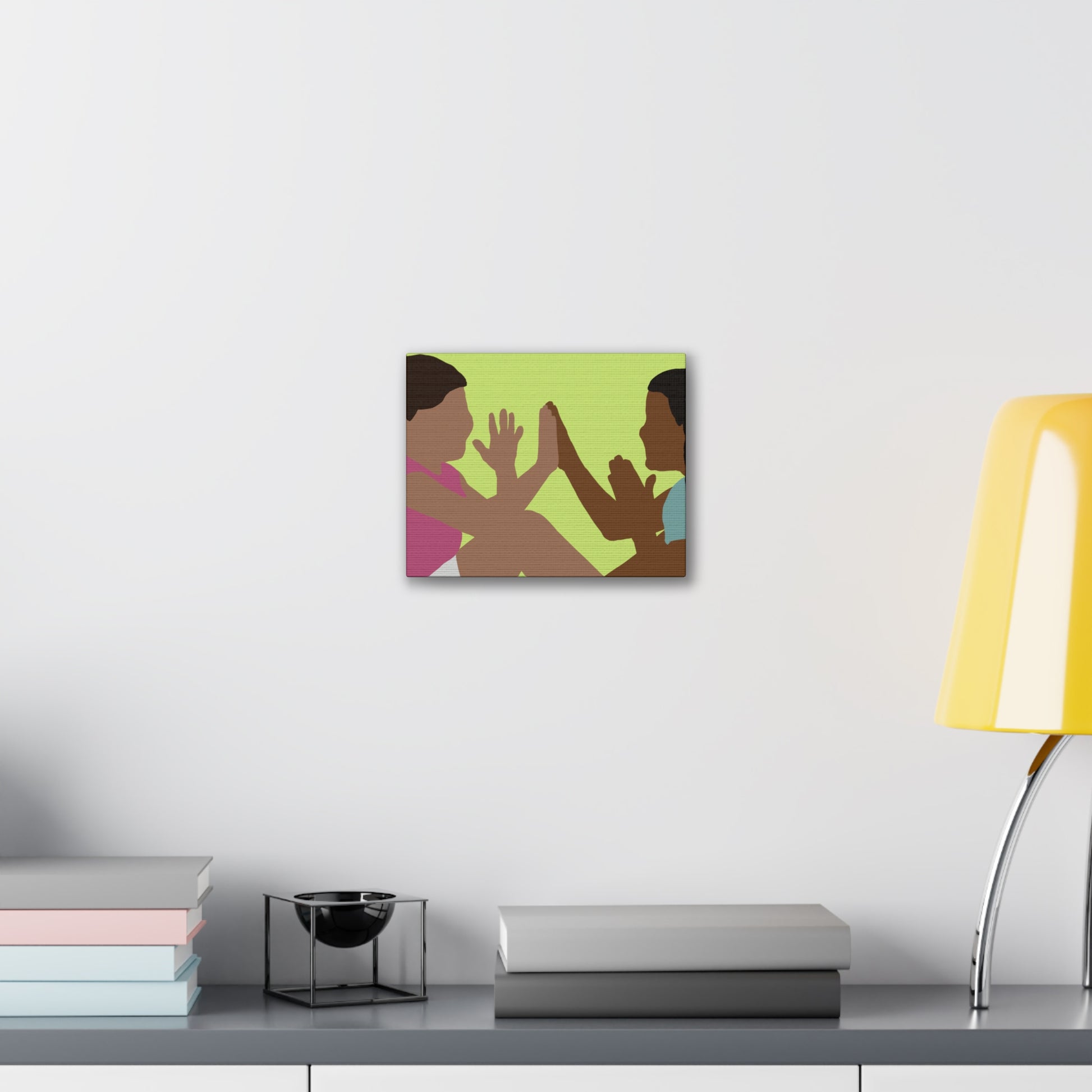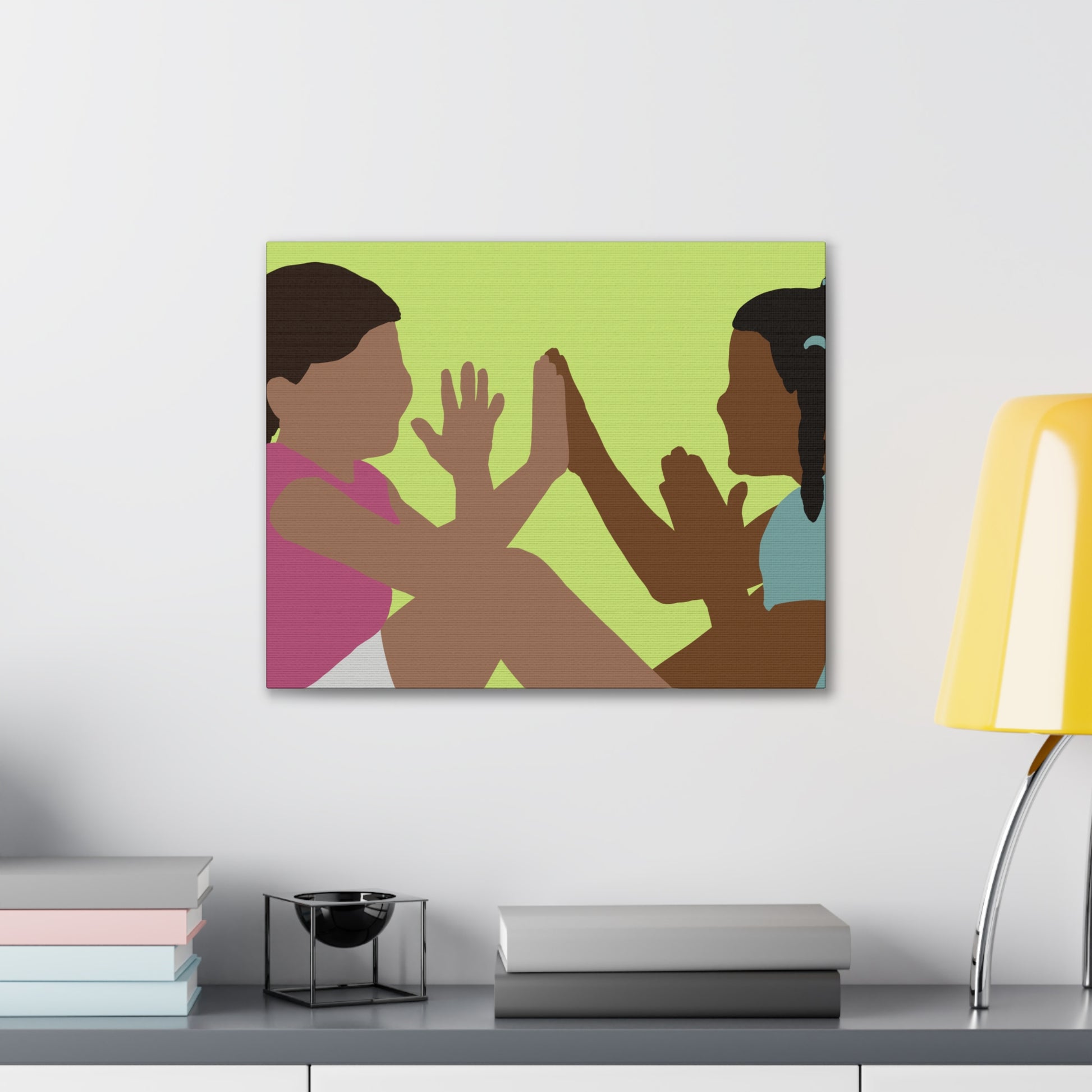A vibrant stretched canvas capturing a playful moment between two children, rendered in bold, flat colors on a fresh lime background. The simplified silhouettes and bright palette bring warmth and energy to a nursery, playroom, classroom, or family space. Mounted on a sturdy pine stretcher, the print arrives ready to hang with included hardware and crisp, fade-resistant inks that keep the scene lively for years. Small production details — like slight edge wrap and a discreet QR code on the back — are noted so you know exactly what to expect. This piece feels like an everyday snapshot of laughter and friendship, an artwork that easily becomes part of daily life and memory-making.