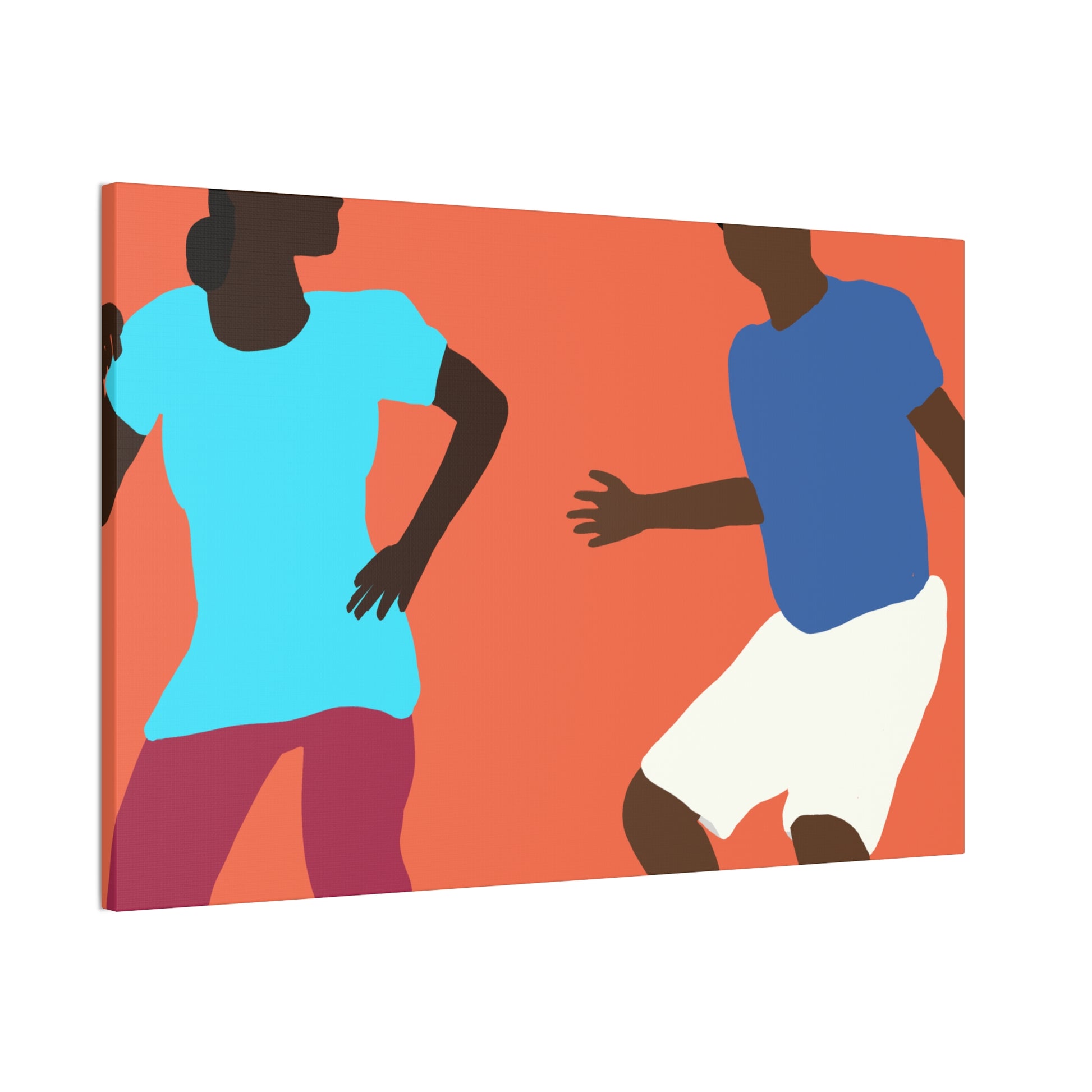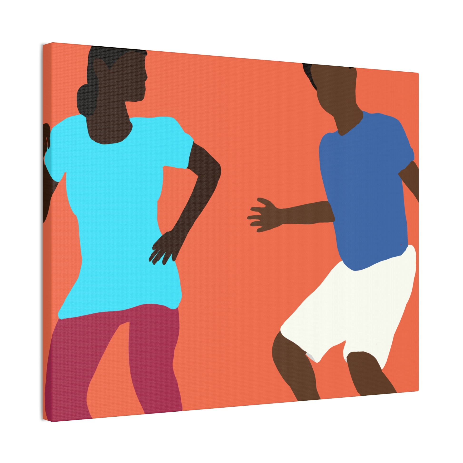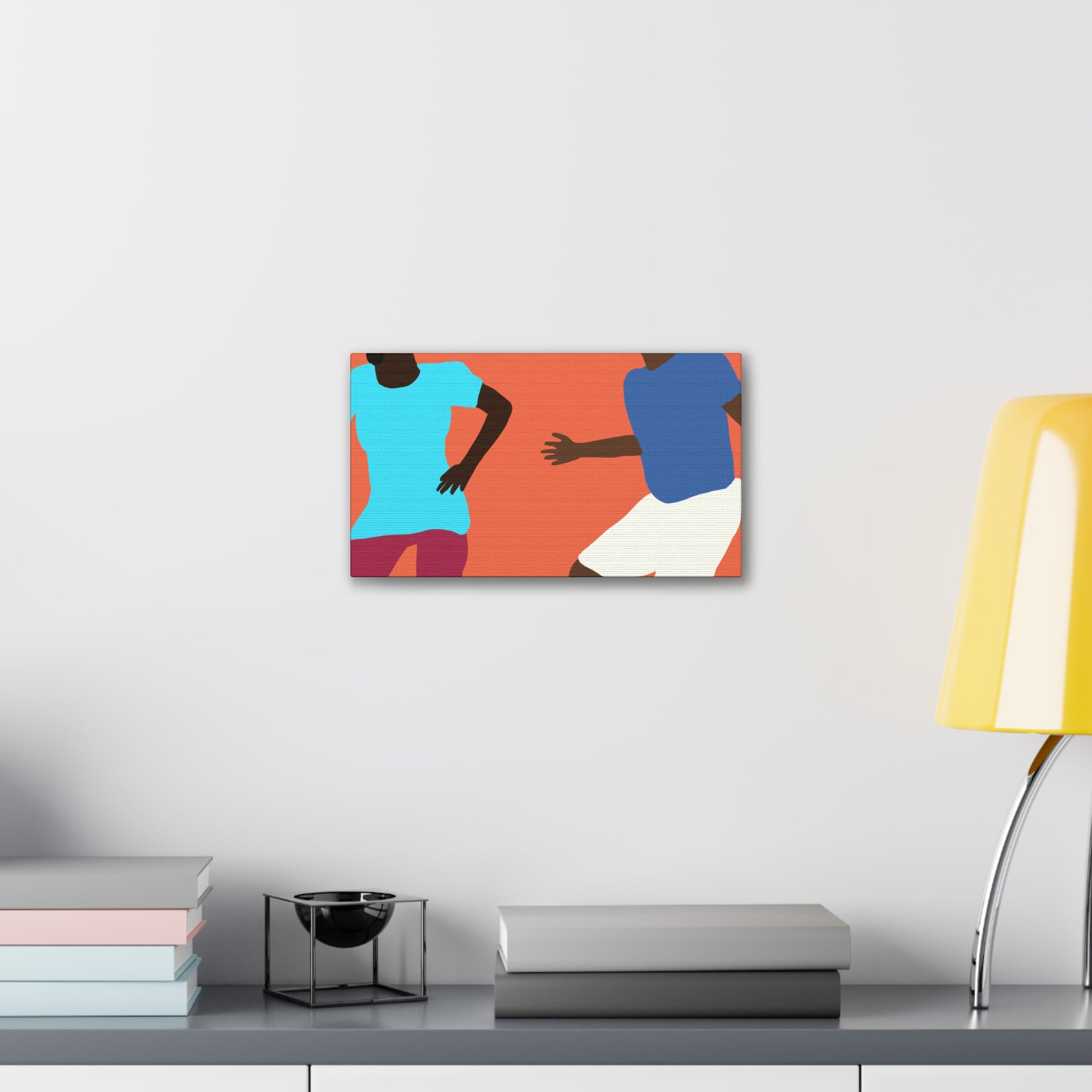 A bright, stretched canvas that brings movement and warmth to any room. Bold, block-color figures dance across a coral field, their gestures captured in a playful, minimalist style. The artwork reads like a snapshot of joy—energetic, modern, and quietly optimistic. Hung in a living room, studio, or hallway, this canvas becomes a focal point that invites conversation and lifts the mood.